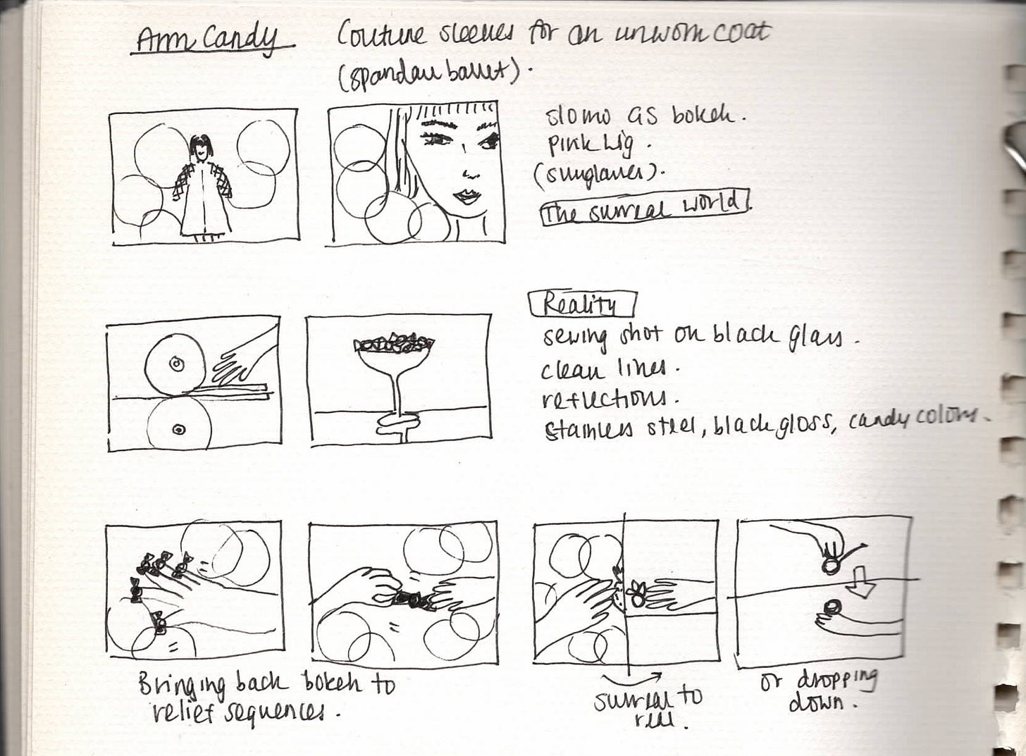 Two years ago, when I first started making videos on YouTube, I sat down and eagerly sketched out a bunch of ideas that I knew I’d want to make some day. Some were material-centric (”Plastic Fantastic”), others more romantic (”Precious Cargo”), and some slightly childish but with potential to be weird in a good way. “Arm Candy” was one of these.