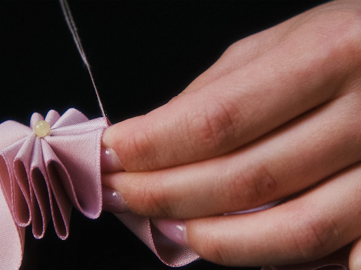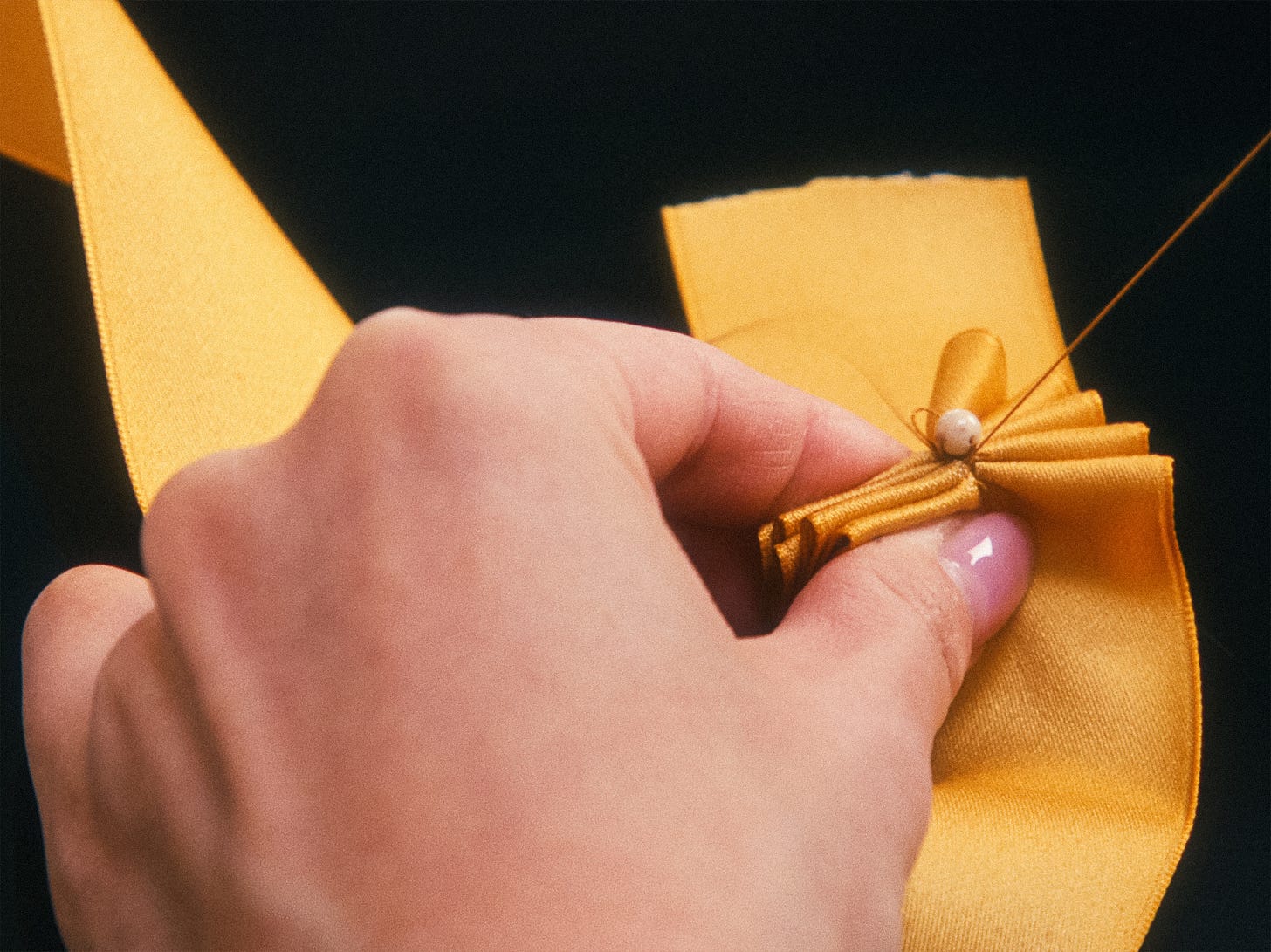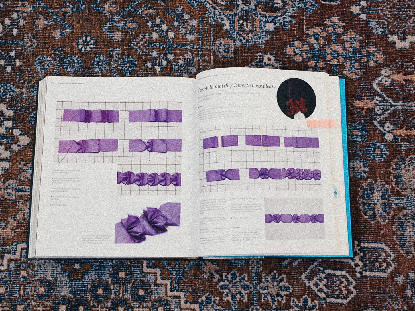 I found the method to the madness within the pages of my favorite couture embellishments book: a two-fold inverted box pleat technique involving ribbons. I like techniques that are complicated in themselves, but that don’t involve precious materials. Anyone can have access to ribbons. A democratic type of couture. For this project, all I needed was some ribbons, beads, matching thread, fabric to create a sleeve base out of, and the usual pins and needles.